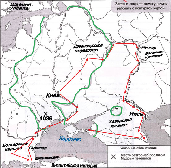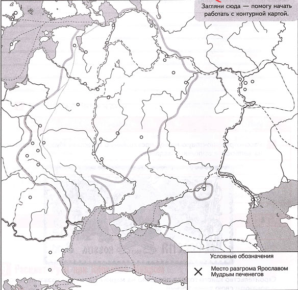 4. Соответствующим знаком обозначьте место разгрома Ярославом Мудрым печенегов. Рядом напишите дату этого сражения.
