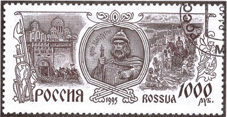 2. Рассмотрите почтовую марку, посвящённую Юрию Долгорукому, и ответьте на вопросы.