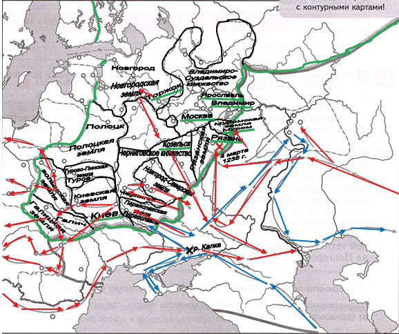 4. Стрелками красного цвета обозначьте поход войск Батыя на Русь. Соответствующим знаком обозначьте место сражения, в котором был разбит князь Юрий Всеволодович. Подпишите дату этого сражения.