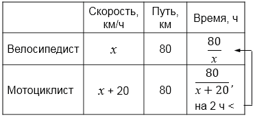 На 80 км пути велосипедист тратит на 2 ч больше, чем мотоциклист, так как его скорость на 20 км/ч меньше, чем скорость мотоциклиста. Найдите скорость велосипедиста.