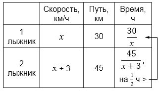 Первый лыжник прошёл дистанцию 30 км на \(\tfrac{1}{2}\) ч быстрее, чем второй дистанцию 45 км, хотя скорость второго была на 3 км/ч больше. За какое время первый лыжник прошёл 30 км?