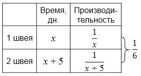 Вводим переменную \(x\) - время работы одной швеи и согласно условию составляем рациональное уравнение через производительность.