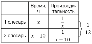 Пусть первый слесарь выполняет всю работу за \(x\) ч. Тогда, учитывая то, что на выполнение половины работы первому потребовалось бы времени на 5 ч больше, чем второму, всю работу второй слесарь выполнит за \(x - 10\) ч.