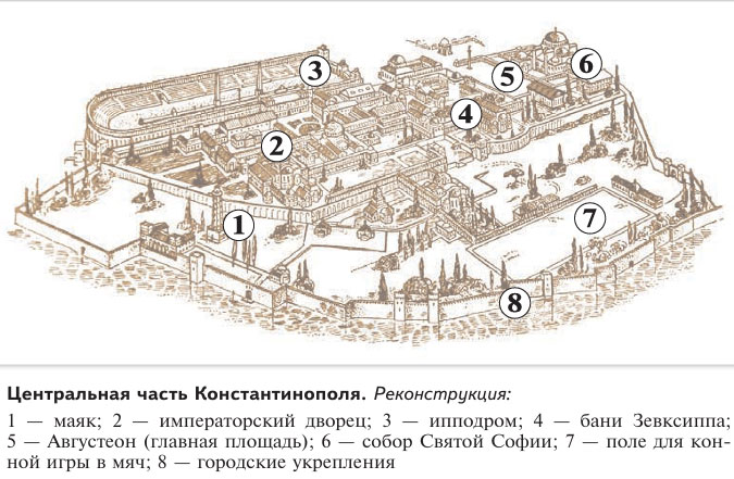 Здания, свидетельствующие о том, что Константинополь был городом с античным прошлым: 1 - маяк, 2 - императорский дворец, 3 - ипподром, 4 - бани Зевксиппа, 7 - поле для конной игры в мяч, 8 - городские укрепления.