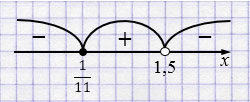 \(\begin{cases} (1-11x)(2x-3) \le 0, \\ x \ne 1,5 \end{cases}\)