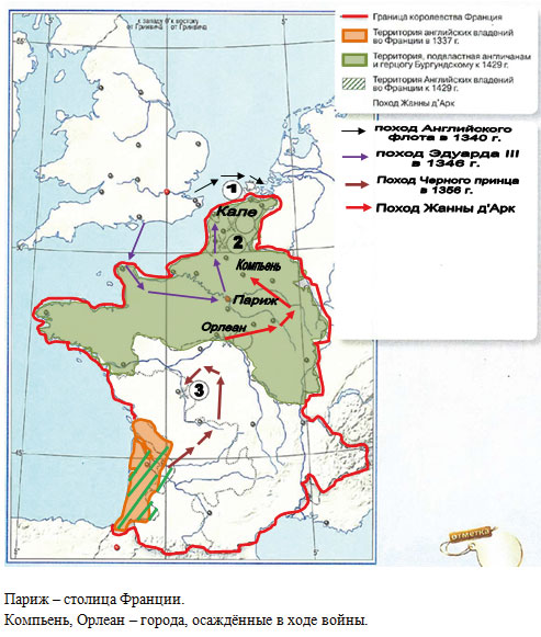 Рассмотрите контурную карту "Подъём средневековой Европы. Столетняя война в 1337 - 1453 гг." и выполните задания.