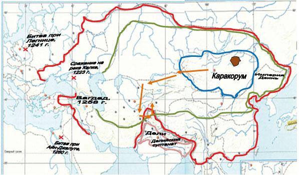 Рассмотрите контурную карту "Многоликое Средневековье. Монгольские завоевания в XIII в." и выполните задания.