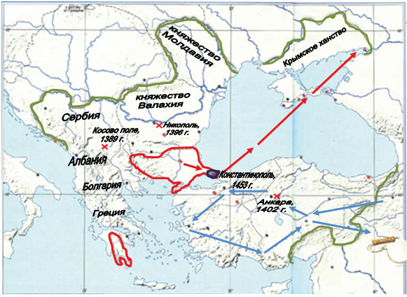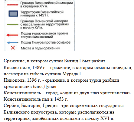 Рассмотрите контурную карту "Многоликое Средневековье. Завоевания турок-османов в XIII - XV вв. Гибель Византийской империи" и выполните задания.