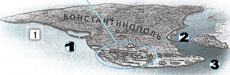 2) Предположите, в чём выгоды расположения Константинополя, если судить по его плану.