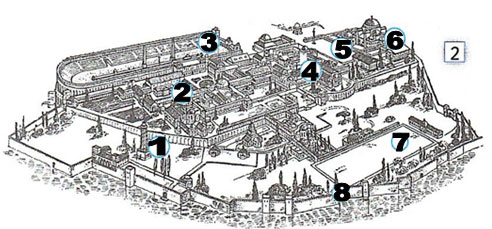 3) Впишите цифры, соответствующие архитектурным объектам реконструкции центральной части Константинополя (2): 1 - маяк; 2 - императорский дворец; 3 - ипподром; 4 - бани Зевксиппа; 5 - Августеон (главная площадь); 6 - собор Святой Софии; 7 - поле для конной игры в мяч; 8 - городские укрепления.