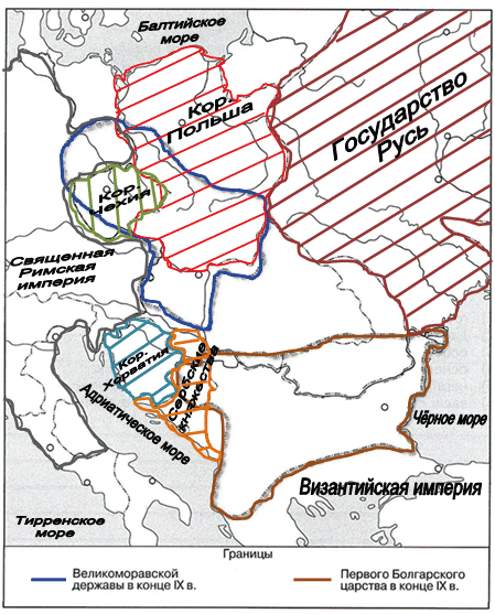 2) Обозначьте разными цветами границы государств в конце IX в.: одним цветом обведите границу Первого Болгарского царства, а другим - Великоморавской державы.