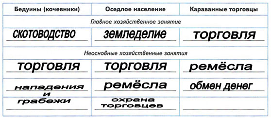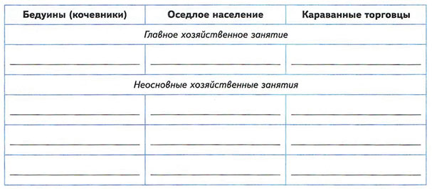 3. Заполните таблицу, вписав хозяйственные занятия, соответствующие различным группам населения Аравийского полуострова.