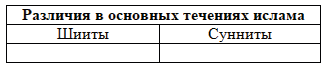 1. Заполните таблицу "Различия между суннитами и шиитами". Впишите цифры приведённых ниже утверждений в соответствующие колонки.