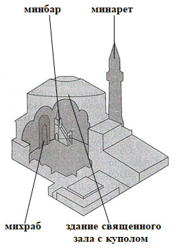 9. Рассмотрите схематичное изображение мечети. Сделайте выноски, выделив основные элементы мечети как архитектурного сооружения. При необходимости воспользуйтесь дополнительными источниками информации.