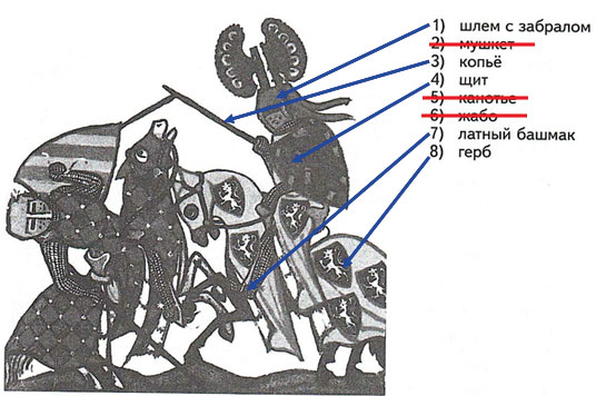5. Рассмотрите изображение средневекового турнира. Соедините линиями верные названия деталей вооружения рыцаря и их изображение на миниатюре. Ошибочные названия зачеркните.
