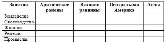 1. Используя учебник и ресурсы Интернета, заполните таблицу. Определите, каким образом (в чём) выражалось влияние природных условий Америки на хозяйственные занятия её жителей. При выполнении ориентируйтесь на задание №4 из §18 (с. 94).