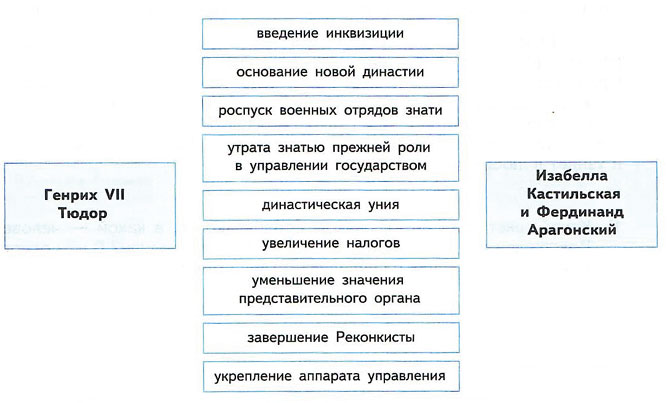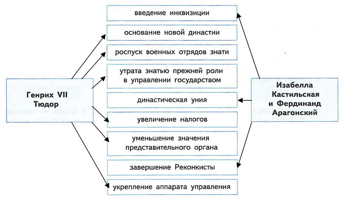 6. Установите соответствие между положениями из списка, относящимися к правителям Англии либо Испании, и именами правителей. Обозначьте связь на схеме стрелками.