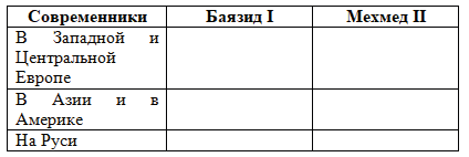 1. Вспомните или найдите в тексте учебника, кто были современники султанов Баязида I и Мехмета II в Западной и Центральной Европе, в Азии и Америке. С помощью дополнительных источников информации назовите их современников на Руси. Оформите результат в виде таблицы.