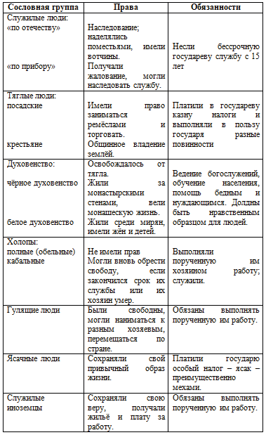 В XVI в. из социальной структуры России исчезли удельные князья, они вошли в состав боярства. В обществе выделились тягловые и служилые люди. Появились новые сословия: холопы, ясачные люди, гулящие люди, служилые иноземцы.