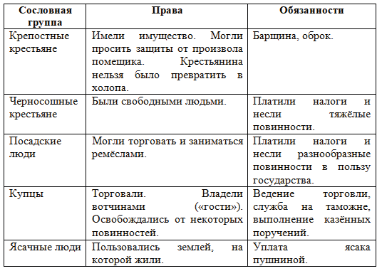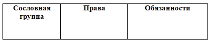 1. Продолжите заполнение таблицы "Сословные группы в России XVII в." на основе текста параграфа.