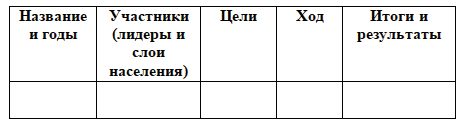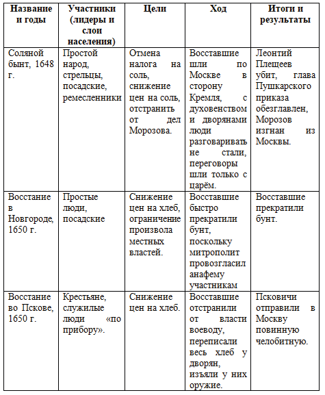 1. Составьте в тетради таблицу "Народные движения в России в середине XVII в.".