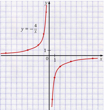 \(y = -\frac{4}{x}\) - гипербола во II и IV четвертях.