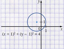 г) \((x+1)^2+(y-1)^2=4\) - окружность с центром в точке \((-1;1)\) и радиусом \(r=2\).