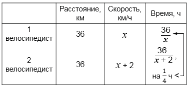 Из деревни в город, находящийся на расстоянии 72 км, отправился велосипедист. Спустя 15 мин навстречу ему из города выехал другой велосипедист, проезжающий в час на 2 км больше первого. Найдите, с какой скоростью ехал каждый из них, если известно, что они встретились в середине пути.