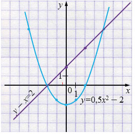 \(\begin{cases} y = 0,5x^2 - 2, \\ y - x = 2 \end{cases}\)