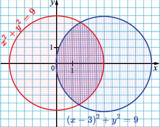 в) \( \begin{cases} x^2 + y^2 \le 9,\\ (x - 3)^2 + y^2 \le 9 \end{cases} \)