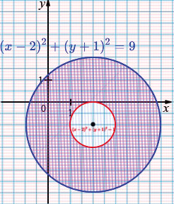 г) \( \begin{cases} (x - 2)^2 + (y + 1)^2 \ge 1,\\ (x - 2)^2 + (y + 1)^2 \le 9. \end{cases} \)