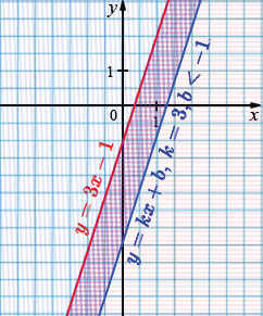 Полоса на плоскости — это множество точек между двумя параллельными прямыми. В нашей системе это возможно только при \(k = 3\) и разных свободных членах. Чтобы пересечение полуплоскостей было именно между прямыми, нижняя граница должна быть ниже верхней: \[ 3x + b \le 3x - 1 \;\Longrightarrow\; b \le -1. \]