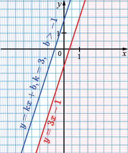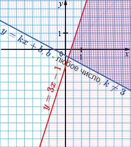 Когда \(k = 3,\ b > -1\), прямая \(y = 3x + b\) выше, чем \(y = 3x - 1\). Тогда для любого \(x\) выполняется \[ 3x + b > 3x - 1, \] и найти \(y\), удовлетворяющее одновременно \[ y \ge 3x + b,\quad y \le 3x - 1, \] невозможно, поэтому решений нет.