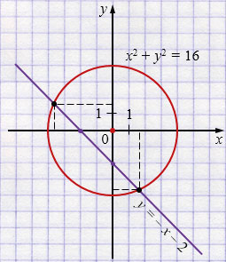 Окружность \(x^2+y^2=16\) и прямая \(x+y+2=0\) пересекаются в точках, координаты которых найдены подстановкой \(y=-x-2\) в уравнение окружности. Получилось квадратное уравнение, давшее два значения \(x\), значит две точки пересечения.