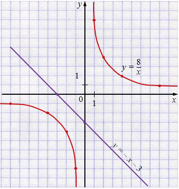 Гипербола \(xy=8\) и прямая \(x+y+3=0\) пересекаются, если существует решение после подстановки \(y=-x-3\). Получилось квадратное уравнение с отрицательным дискриминантом, значит графики не имеют общих точек.
