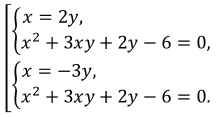 \(\begin{cases} x = 2y,\\ (2y)^2+3\cdot2y\cdot y+2y-6=0\end{cases}\)