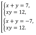 1) \(\begin{cases}x+y=7,\\ xy=12 \end{cases}\)