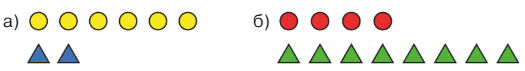 б) 1) 9 : 3 = 3 (р.) - треугольников больше, чем кружков.