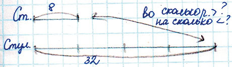 1) 32 : 8 = 4 (р.) - больше стульев, чем столов.