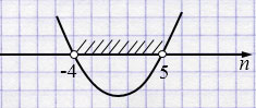 В данном случае это квадратное неравенство \(n^2-n-20<0\). Сначала находятся корни соответствующего квадратного уравнения \(n^2-n-20=0\). Они равны \(-4\) и \(5\).