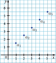 Для изображения на координатной плоскости по оси \(x\) откладывается номер члена прогрессии, а по оси \(y\) — значение соответствующего члена. Полученные пары чисел записываются в виде координат точек.