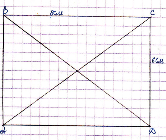 20. Начерти прямоугольник ABCD, длина которого равна 8 см, а ширина 6 см. Найди его периметр. Проведи отрезки АС и BD (диагонали) и измерь их. Что ты замечаешь?