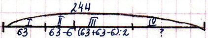 71. В эстафете приняли участие команды четырёх школ, всего 244 ученика. В первой команде было 63 ученика, во второй - на 6 учеников меньше, чем в первой, а в третьей - в 2 раза меньше, чем в первой и второй командах вместе. Сколько учеников было в четвёртой команде?