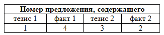 5. Прочитайте четыре предложения. Два из них являются тезисами (положениями, которые требуется аргументировать). Другие два содержат факты, которые могут послужить для аргументации этих тезисов. Подберите для каждого из тезисов соответствующий ему факт. Номера соответствующих предложений запишите в таблицу.