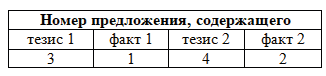 6. Прочитайте четыре предложения. Два из них являются тезисами (положениями, которые требуется аргументировать). Другие два содержат факты, которые могут послужить для аргументации этих тезисов. Подберите для каждого из тезисов соответствующий ему факт. Номера соответствующих предложений запишите в таблицу.