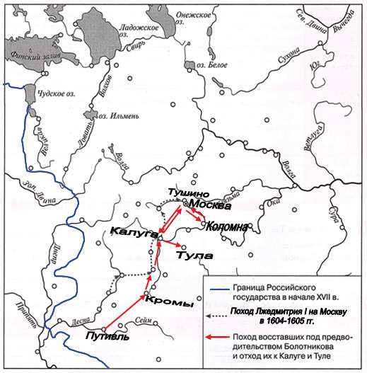 2) Обозначьте стрелками красного цвета поход на Москву восставших под руководством Ивана Болотникова и напишите имя российского монарха, правящего страной в этот период.