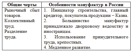 7. Сравните западноевропейскую мануфактуру с мануфактурами, возникшими в России при первых Романовых. Что между ними общего и в чём различия? Заполните таблицу.