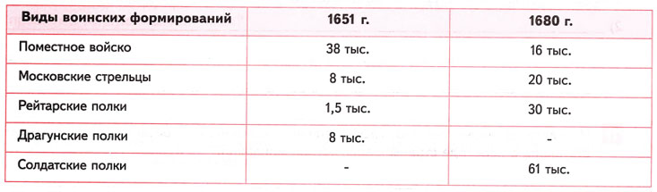 8. Познакомьтесь с данными о численности различных формирований в русском войске в середине и в конце XVII в. Какие выводы (не менее трёх) можно сделать?