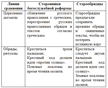 4. Сравните взгляды на православие сторонников богослужебной реформы и старообрядцев. Ответ оформите в виде таблицы.