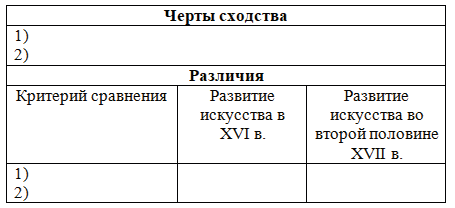 10. Сравните развитие искусства в XVI в. и во второй половине XVII в. Заполните таблицу.